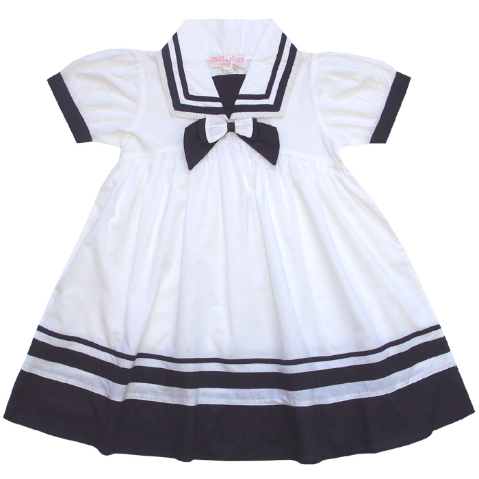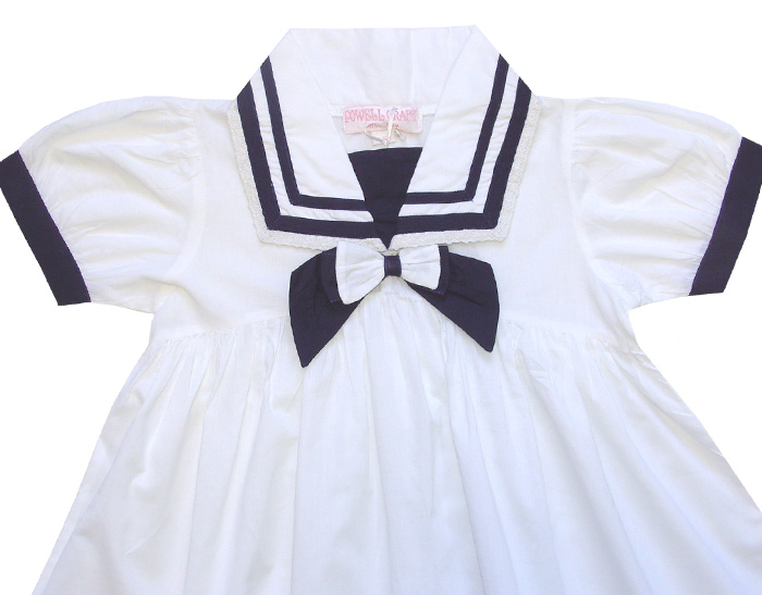 Klassisk vit sjömansklänning med korta ärmar och marinblåa detaljer. Sjömanskrage är dekorerat med smal spetskant längst ut. Stor rosett på framsidan.