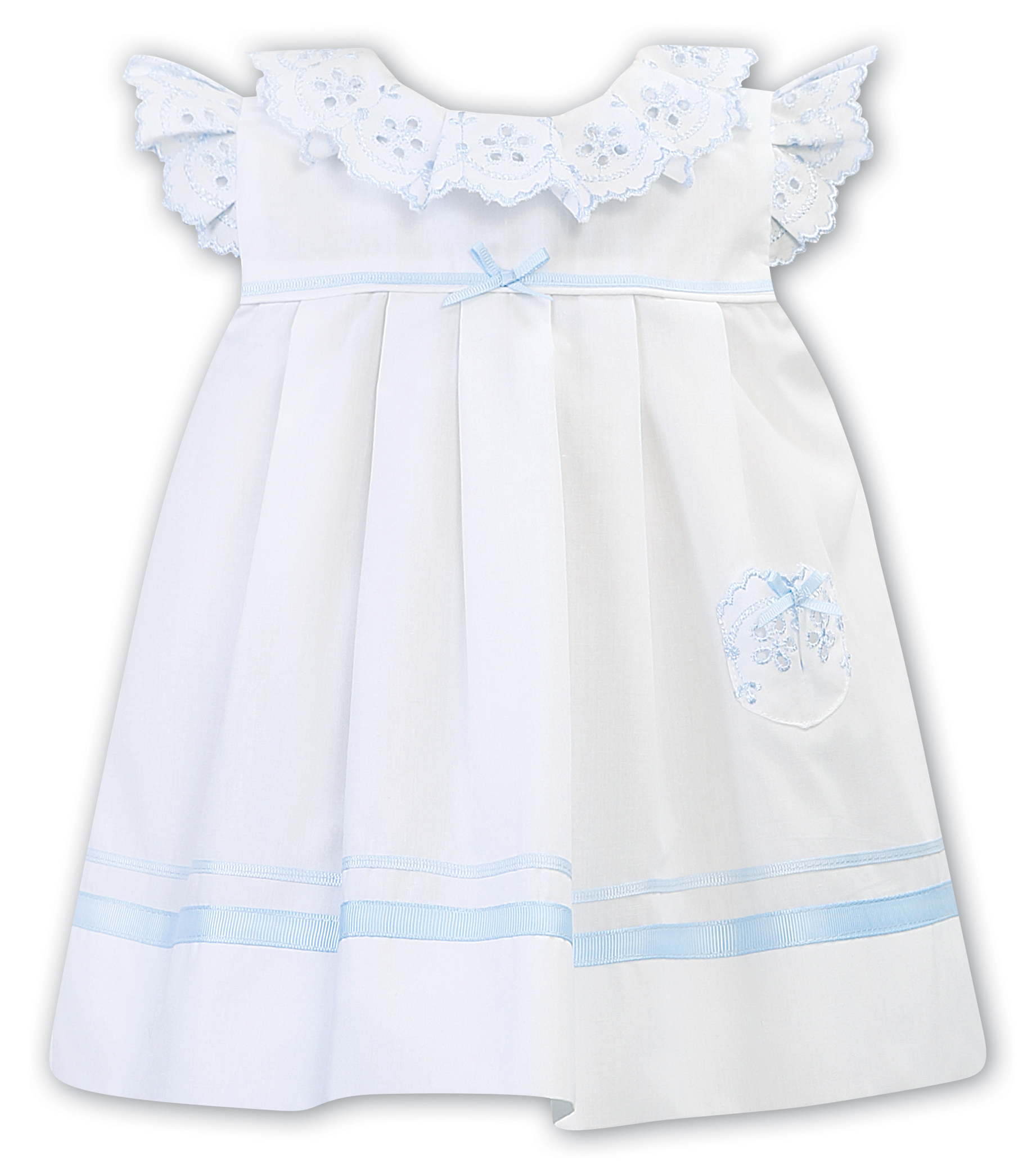 Sjömansklänning Ronja – vitt och ljusblått. Finns i storlekar 68-86 cm.