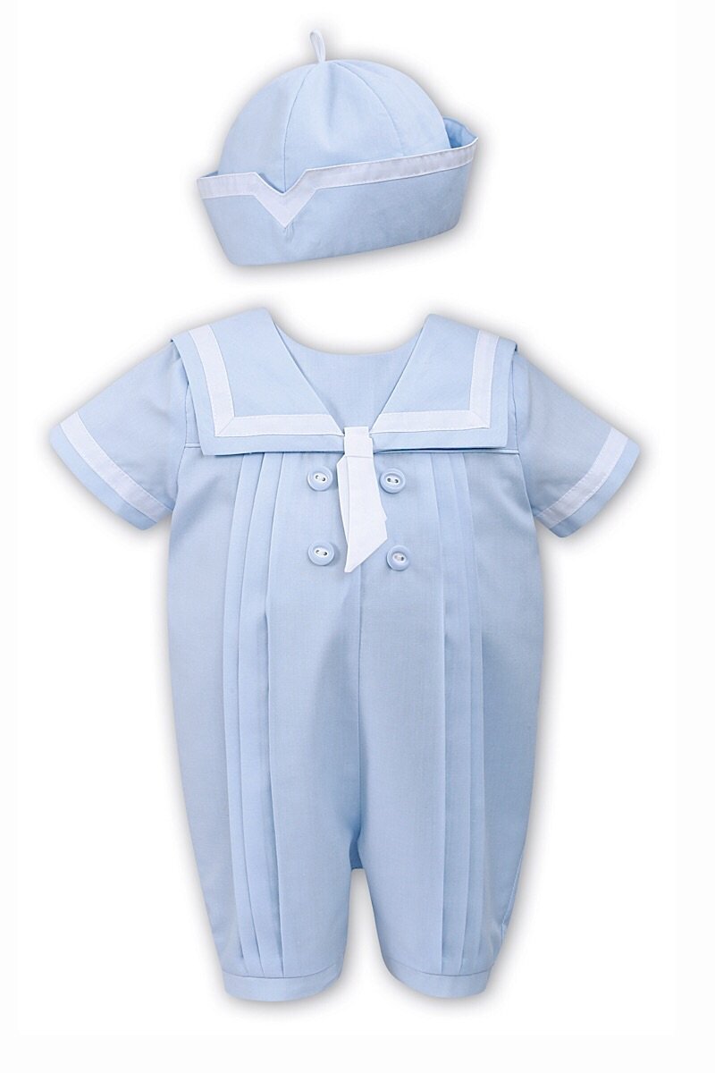 Elegant sjömansdräkt och matchande hatt i ljusblått med vita detaljer på. Sjömanskrage både fram och bak, korta ärmar och korta ben (shortslängd). Mycket bekväm allt-i-ett overall modell med knäppning både baktill i ryggen och mellan ben som underlättar blöjbyte. Passar perfekt till fest och dop.