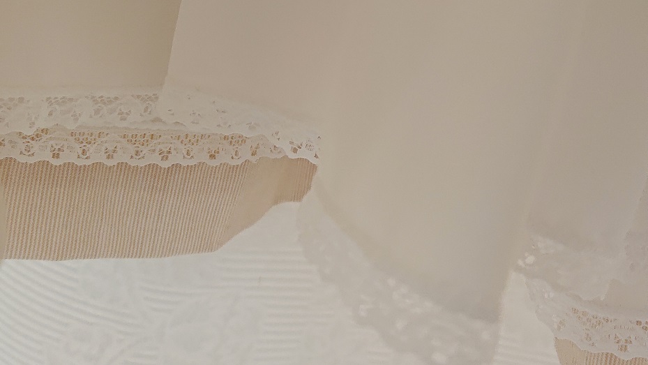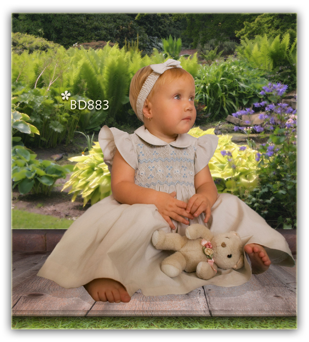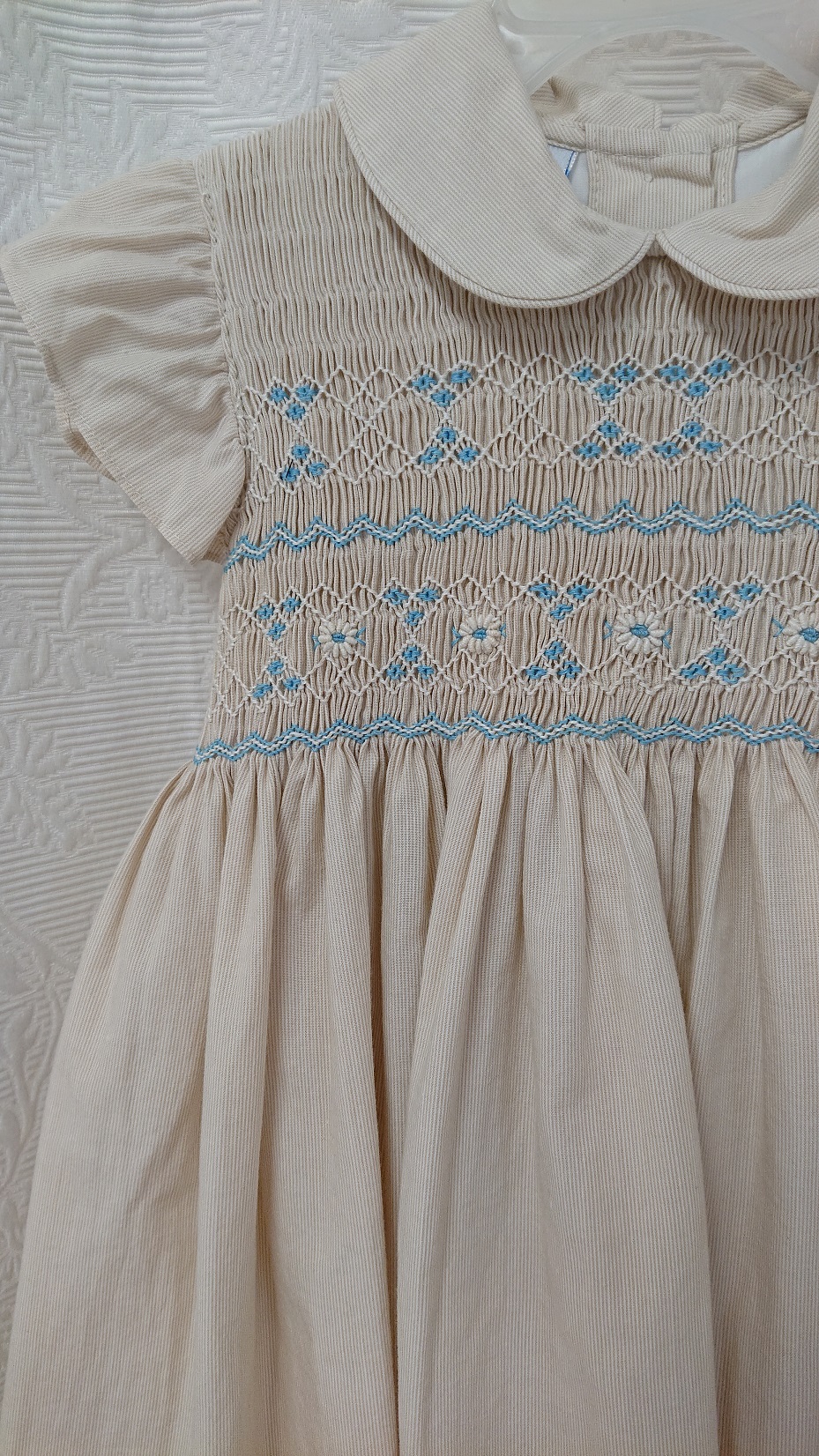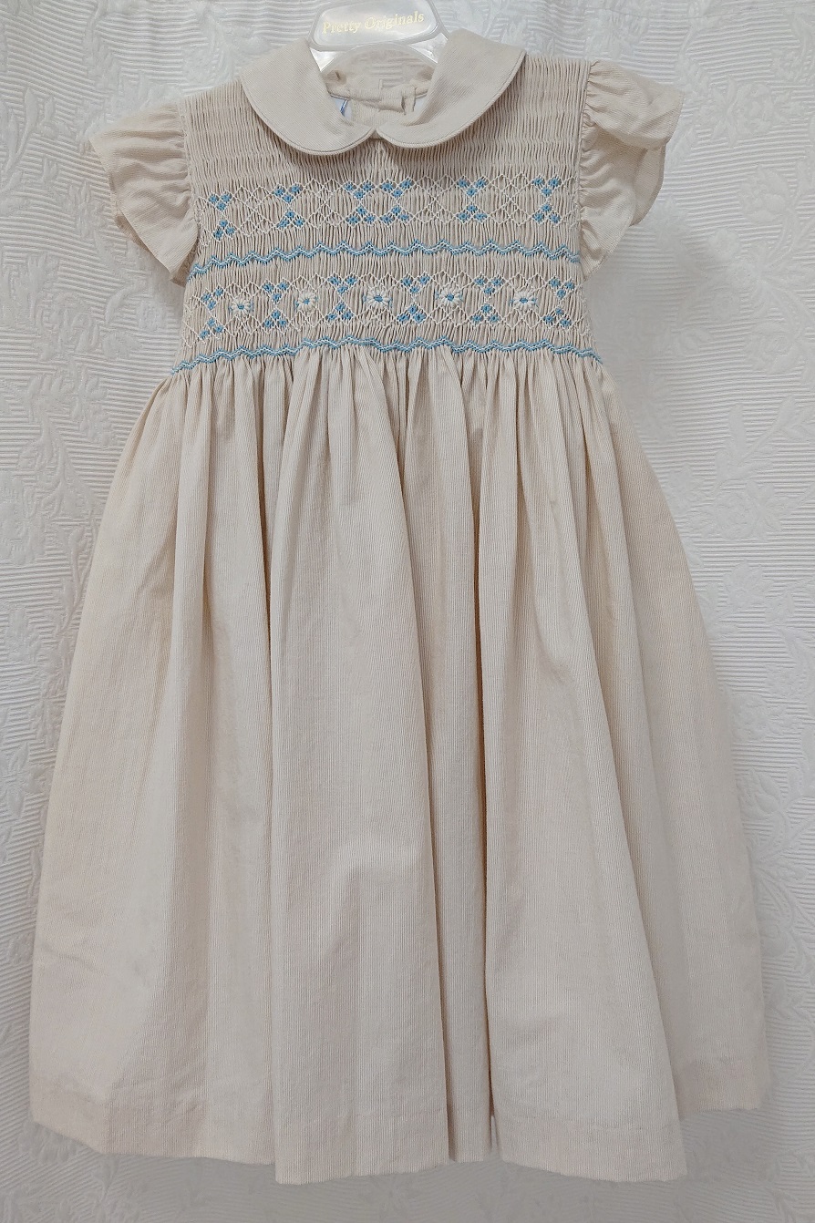 Handsmockad finklänning i beige med blått mönster i smockningen. Korta fjärilsärmar ger lätthet. Knäppning i ryggen. Svagt ribbad beige bomullstyg. Underkjol med vacker spetskant.