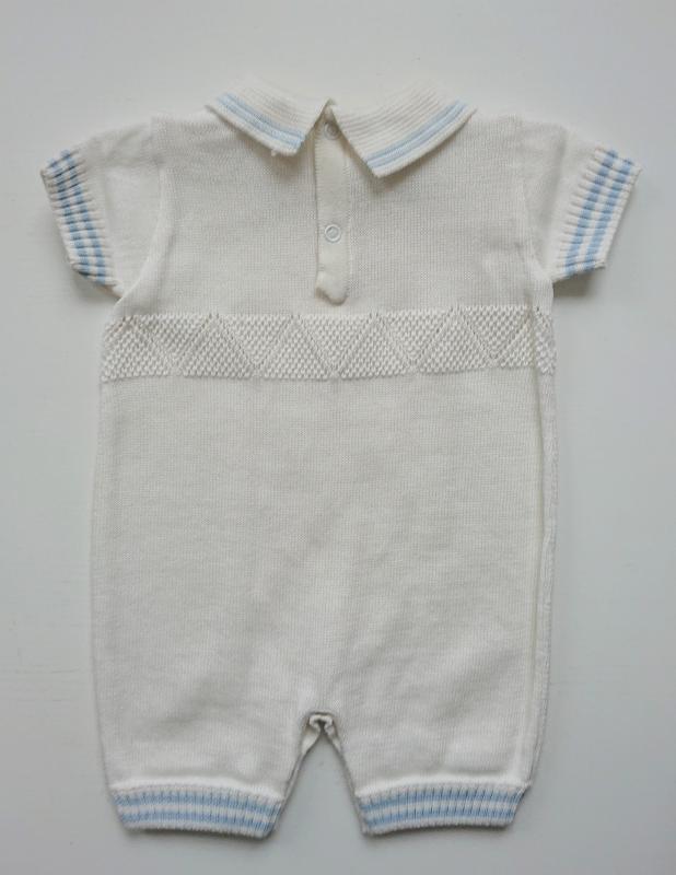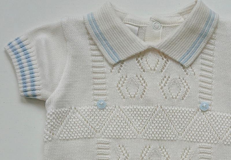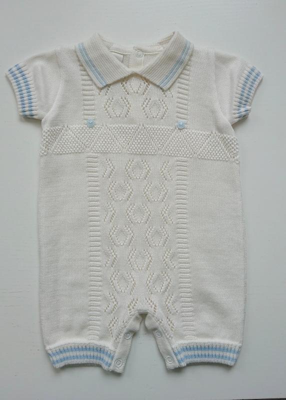 Vacker spetsstickad hålmönstrad outfit med korta ärmar och ben. Tillverkad av 100% mjukt bomull passandes till den nyfödde bebisen. Knäppning meddlan ben och i ryggen. Ljusblåa detaljer. Vacker plagg till bebis när man vill varan extra fin. Köp till matchande stickad mössa.