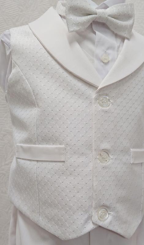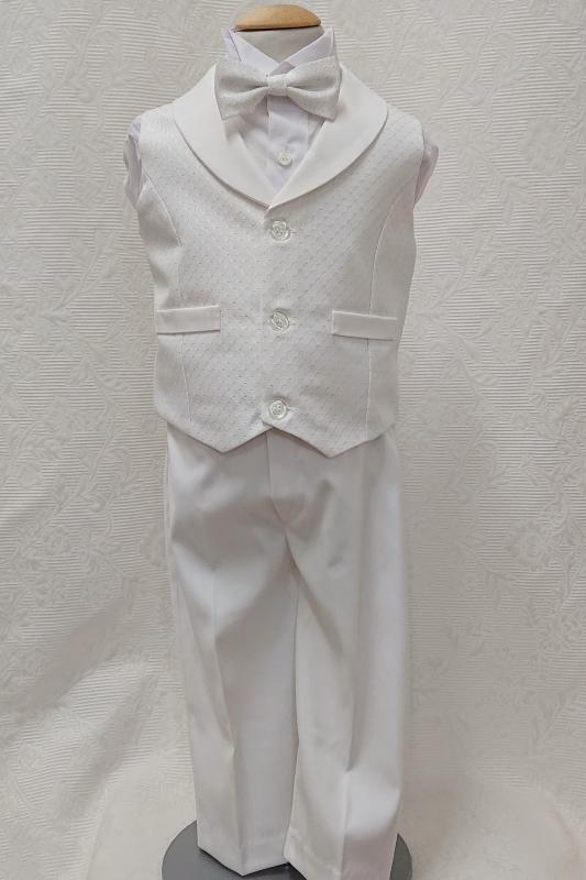 Stilig vit babykostym bestående av fyra delar. Väst och fluga med diamantmönster med silvertråd som ”diamant”. Västen har tre knappar, låtsas fickor på framsidan, sjalkrage och slätt tyg på kragen lika baksidan av västen. Vita raka finbyxor med resår i ryggsidan samt vit långärmar skjorta med vingkrage. Färdig knuten fluga har stängning med kardborre. Mycket fin kostym till de allra minsta för dop, fest och bröllop.