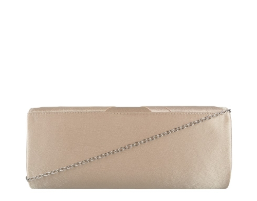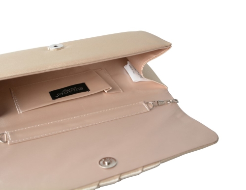 En klassisk aftonväska i champagne från Bulaggi. Satinväska med rutnätmönster som dekoration på framsidan. Stängs med magnetlås. Två olika axelremmar i metall i olika längder medföljer. Mycket fin väska som passar till en balklänning eller aftonklänning.