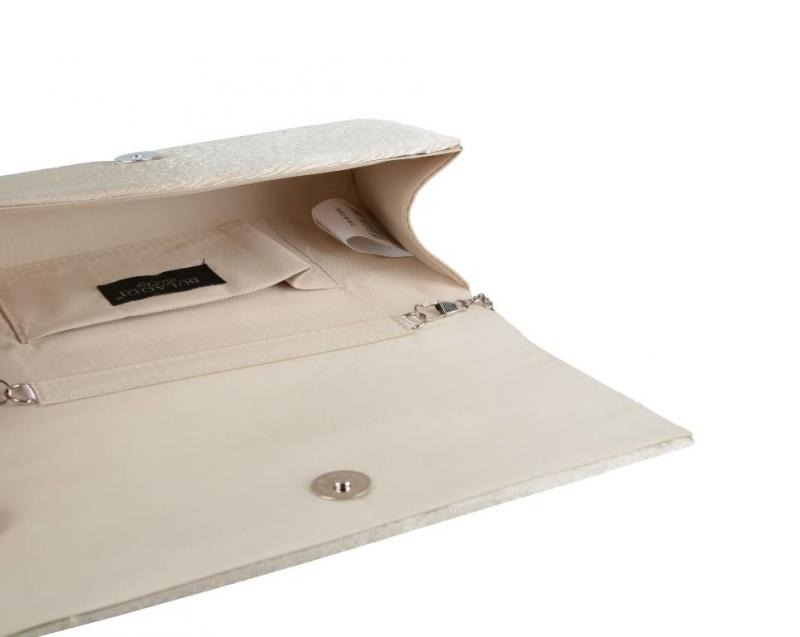 Elegant clutch väska som stängs med magnetlås under locket. Lång axelband i metall medföljer. Lagom stor så att du kan ha alla viktiga saker med dig.