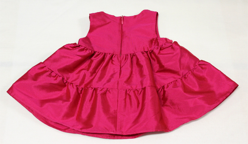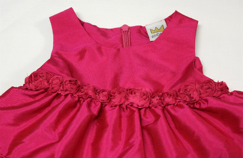 Söt ärmlös babyklänning i fuschia. Ljuvlig blomsterdekoration under livet. Blixtlås i ryggen. Denna finklänning är mycket användbar och kan användas till vardag och fest. Lägg till en blus under eller en bolero eller kofta över.
