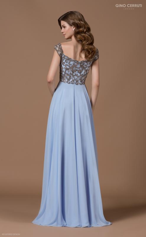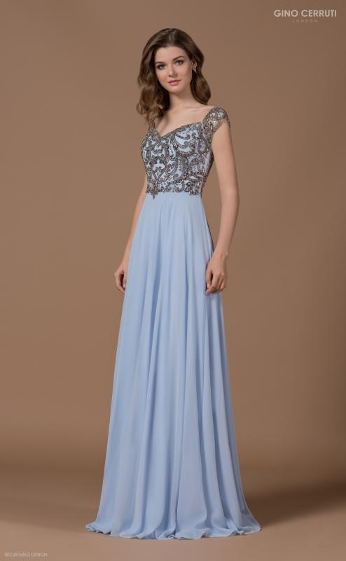 Elegant balklänning med täckta axlar och silvergråa paljetter och pärlor på hela livet både fram och bak. Härlig vid chiffonkjol.