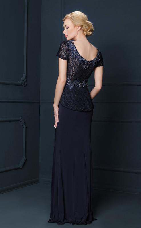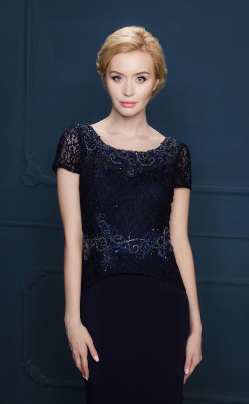 Charmig och elegant aftonklänning i mörkblått. vacker överdel i spets. Pärl- och paljettdekoration pryder midjan och urringningen. Lång kjol i bekväm strech jersey.
