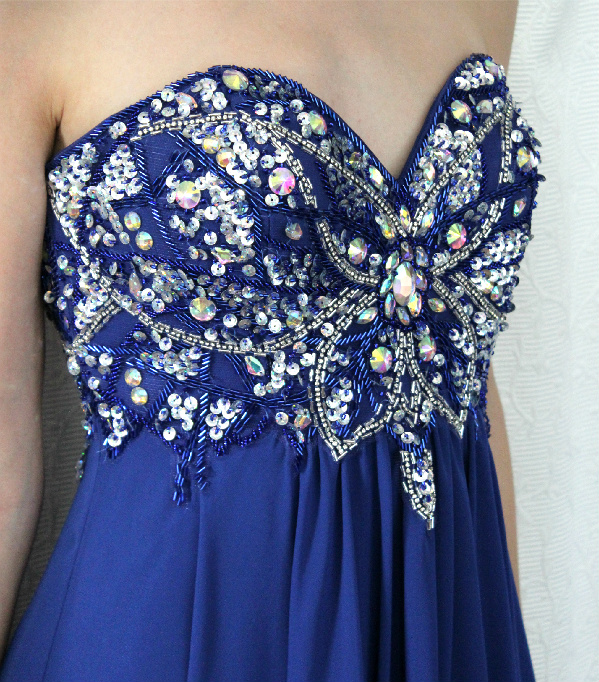 Tjusig lång balklänning i Royal blå med mycket glitter på livet. Finns i storlek 34.