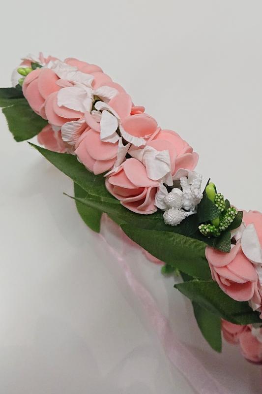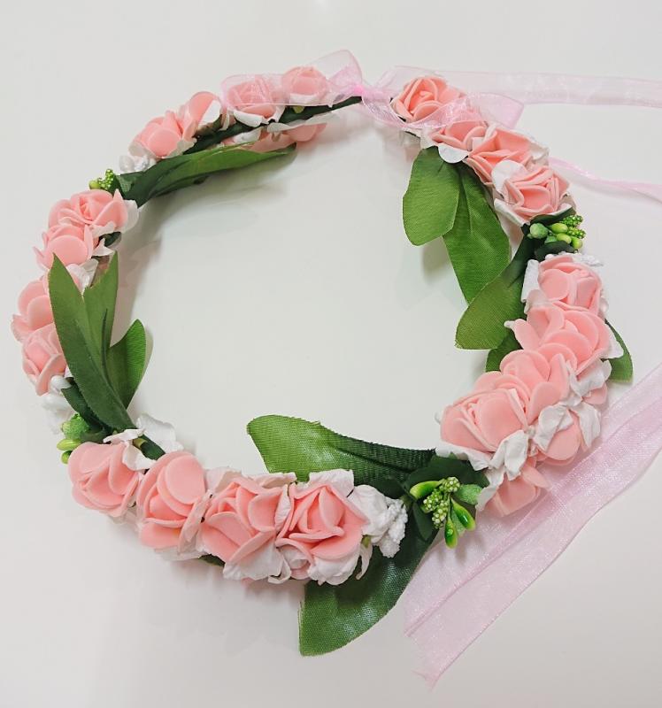 Vacker aprikosrosa blomsterkrans och matchande armband till barn. Blomsterkransen blir fin till bröllop, kalas, midsommar, fest eller när man vill vara extra fin. Dekorerat med smala rosa band så att du kan justera storleken till större.