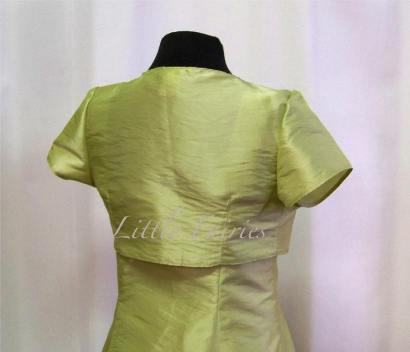 Stilig kortärmad äppelgrön bolero i taft. Öppen framsida.