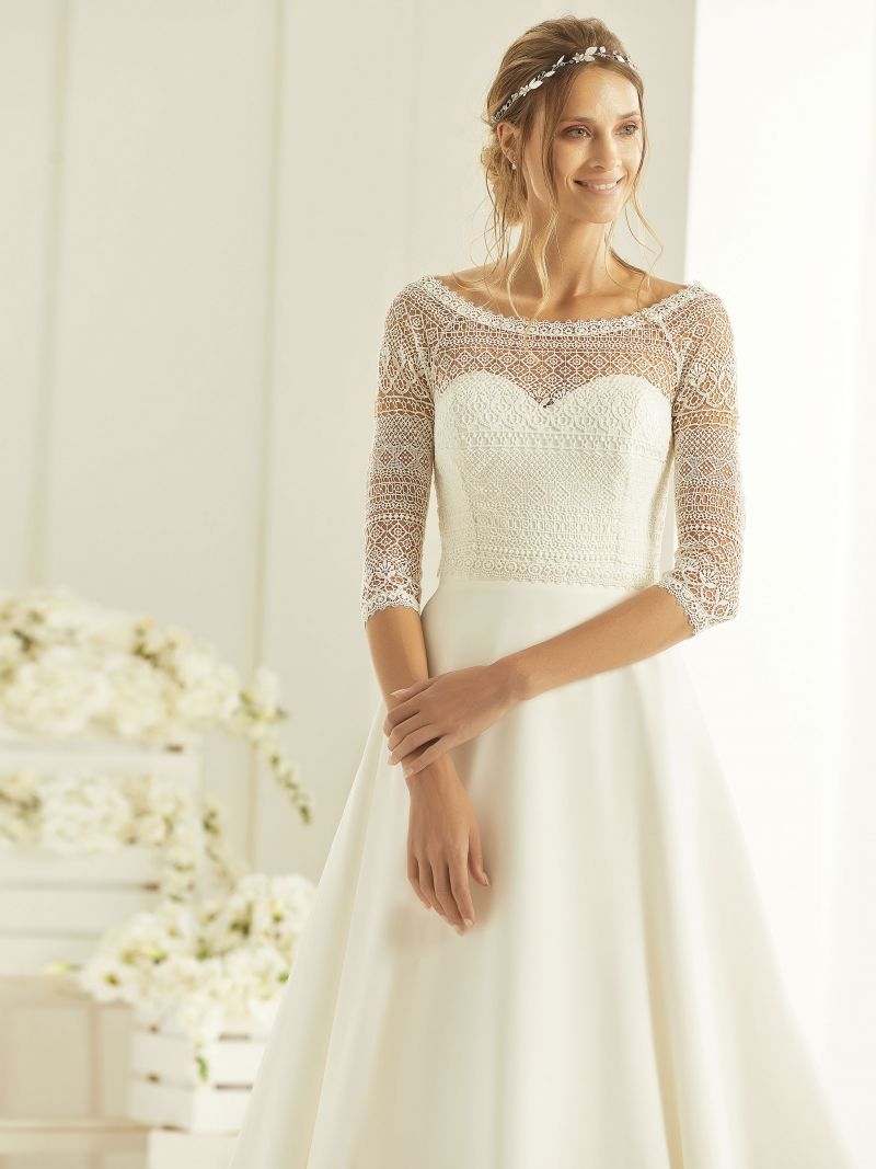 Mycket elegant brudklänning som har många ansikten om du väljer att lägga till bälte eller bolero. Ge denna vackra modell din egen personlighet.