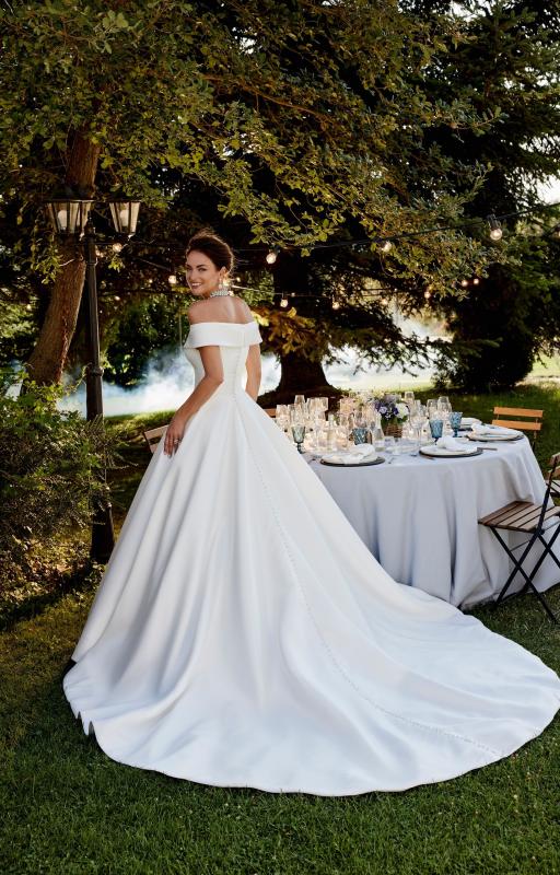 Sofistikerad och elegant prinsessklänning i vackert mikado tyg. Off-shoulder axlar bröllopsklänning är perfekt för en modern brud. Halsringningen skapar en kunglig och tidlös look.