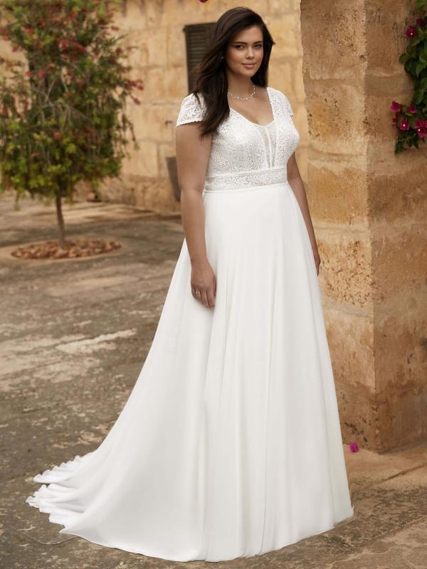 Sofistikerad brudklänning med hint av bohem. Vacker "virkad" spets och A-linje kjol, lika vacker i alla storlekar från 36 till storlek 48.