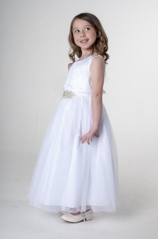 Lyxig gräddvit (ej vit som på bild) brudnäbbsklänning med prickig tyllkjol och blingig detalj på midjan. Elegant liv i satin. Satintyg under tyllkjol och underst underkjol med tyllkant som ger vidd till kjolen. Satinband i ryggen kan knytas till en rosett. Blixtlås i ryggen.