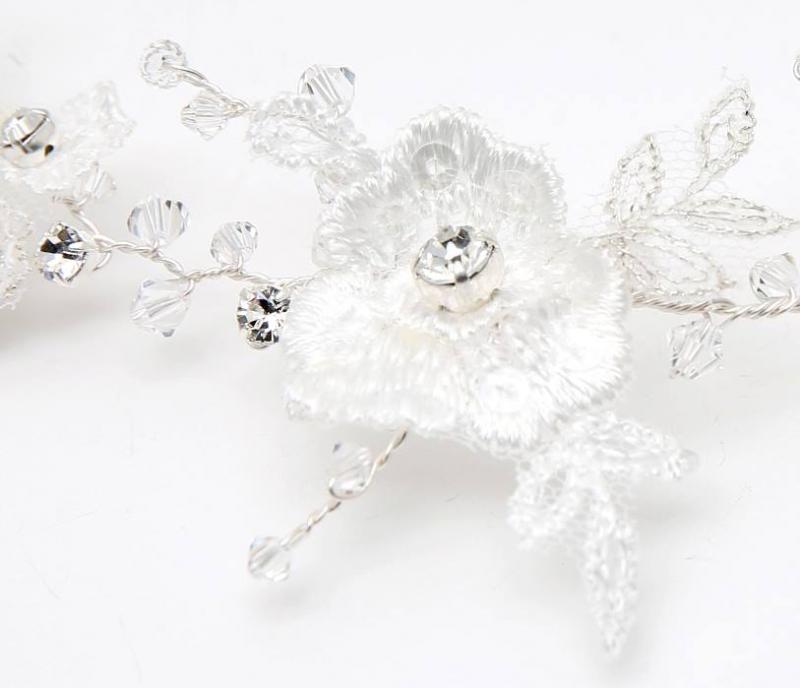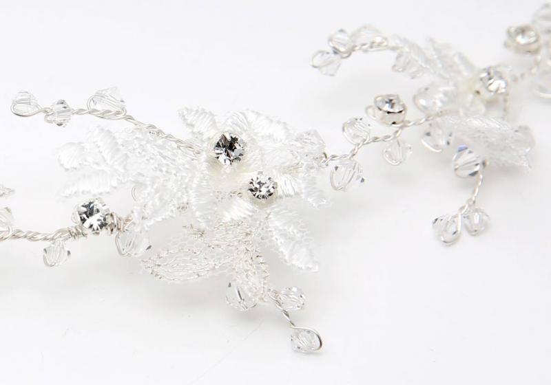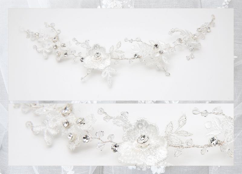 Romantisk böjbar hårsmycke, hair vine, med kristaller och benvitt spets. Denna modell är lätt att bära och kan böjas lätt. Sätt fast den med hårpinnar.