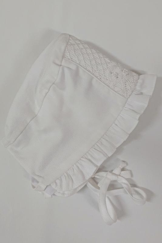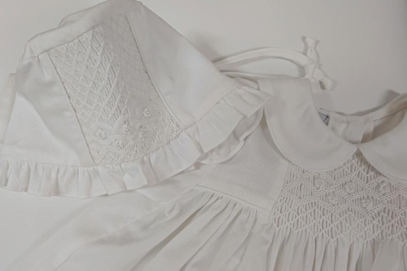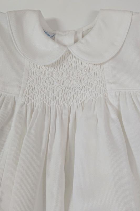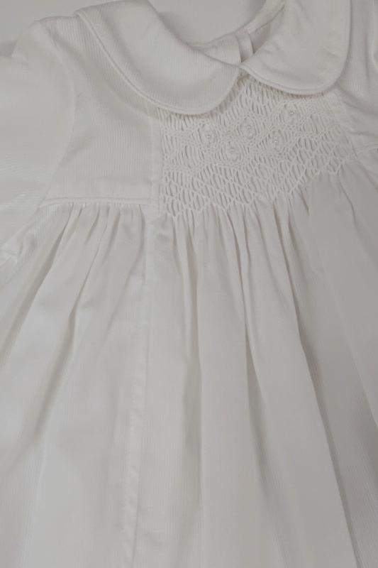 Stilren dopklänning med långa ärmar och matchande hätta. Söt krage med rundade kanter. Vacker smocking mitt på bysten. Tillverkad av lite kraftigare vitt bomullstyg med struktur. Knäppning högst upp i ryggen, resten är öppen så att det är lätt att hålla i barnet utan att klänningen blir skrynklig. Matchande dophätta medföljer.