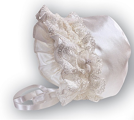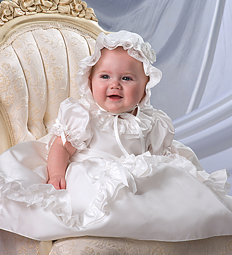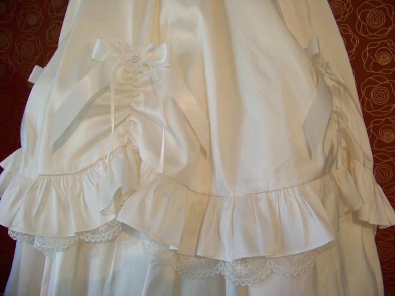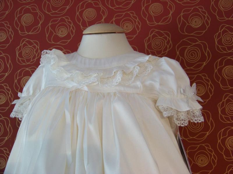 Unik dopklänning i siden med korta puffärmar kantade med spets och dekorerade med sidenblomma och sidenrosett. Volang- och spetskant runt halsöppningen. Kjodelen är dekorerad med volanger och spetskant i olika lager. Sidenrosetter och sidenblommor dekorerar kjolen. Knäppning baktill. Underkjol med rejäl tyllkant ger extra vidd till klänningen. Matchande vacker dophätta.