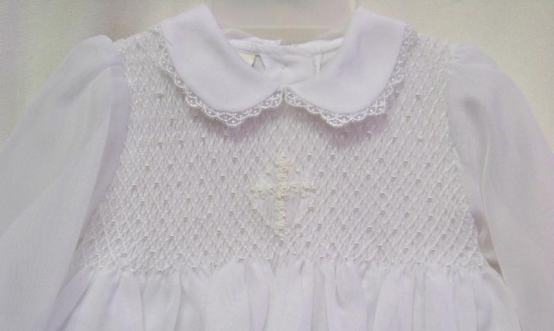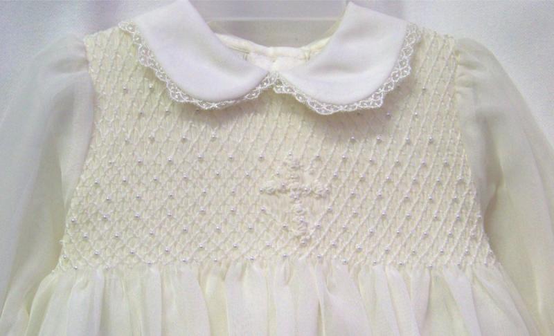 Mycket elegant hellång dopklänning i lätt och tunnt voile . Handsmockad liv med broderad kors på. Små pärlor dekorerar bysten. Rund krage med smal spetskant, samma spets har man använt att kanta långa ärmar samt kjoldelen med. Brett band på ryggen som kan knytas till en rosett. Underkjol i bomull. Mellanlager i tyll. Matchande dopmössa medföljer. Passar mycket bra för flickor och pojkar!