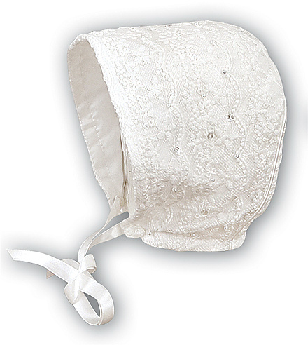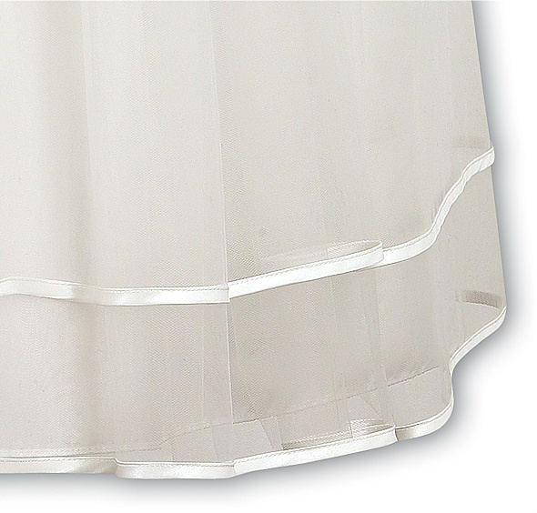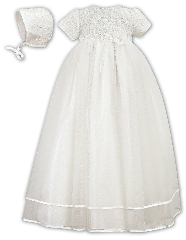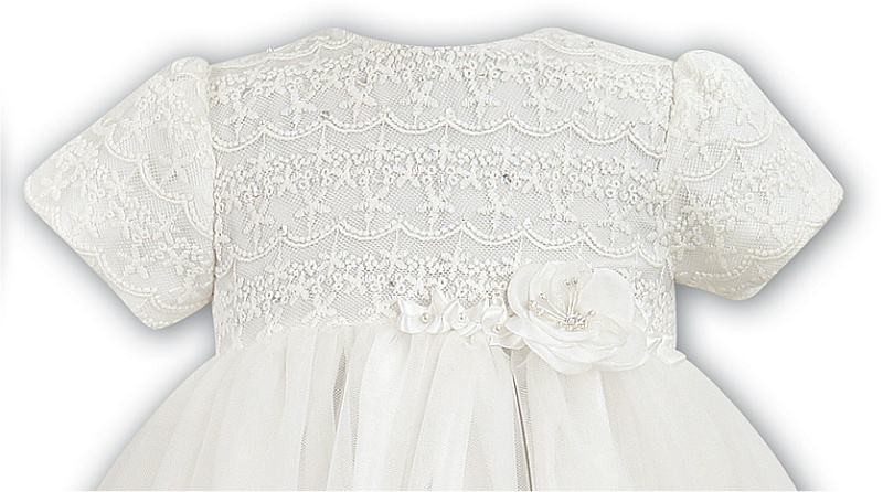 Ljuvlig benvit dopklänning med söta korta ärmar och exklusiv spets på överdelen och ärmar. Livet är dekorerad med fåtal pärlor och paljetter. En stor och fyra små blommor pryder vänstra sidan av midjan. Kjolen består av två lager tyll med en vacker sidenkant i olika längder. Under det lite styvare tyll samt underkjol med tyllkant. Bomull/polyestertyg närmast till barnet. Knäppning baktill. Matchande hätta medföljer. Mycket vacker och romantisk modell.