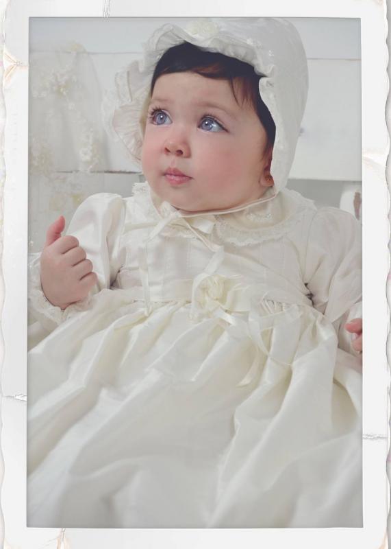 Vacker benvit lång dopklänning med långa ärmar och söt peter pan krage med spets kant och små söta broderade blommor på. Livet är dekorerad stramt med smala lodrätta stråveck samt en sidenblomma och band i mitten. Rynkad liv ger extra vidd och bekvämlighet till lilla barnet. Stråveck förekommer även vid kjolfållet och är stäcker högre i mitten och lägre på sidorna av dopklänningen. Ovanpå detta spetsband och ovanpå spetsen handbroderade blommor och pärlor. Spetskant runt kjolen. Knäppning i ryggen med vackra knappar i musselskal. Öppning i ryggen som underlättar när du håller i barnet då blir inte dopklänningen skrynklig och kommer till sin rätta. Matchande dophätta medföljer. Under sidentyget finns lager i tyll som ger vidd till klänningen och längst in mot barnet mjukare foder i bomull/polyester.