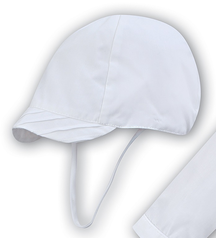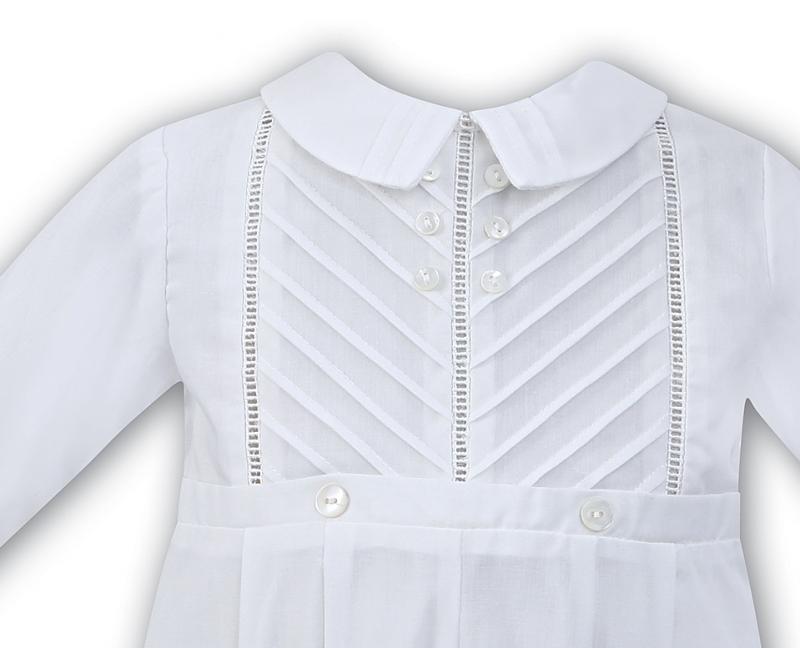 Elegant dopkostym i overall, allt-i-ett, modell. Detta är mycket bekväm och praktiskt för lille bebisen. Mycket vackra dekorationer framtill med veck och knappar som dekoration. Långärmad med långa ben. Knäppning mellan ben och i ryggen. Fodrad. Matchande keps medföljer.
