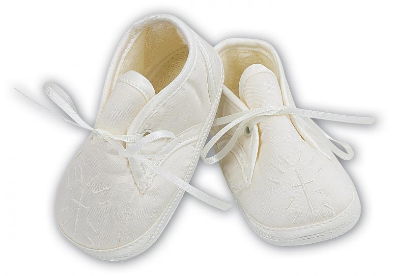 Ljuvliga dopskor i siden. Snörning med smal sidenband. Framsidan är dekorerad med broderad kors.