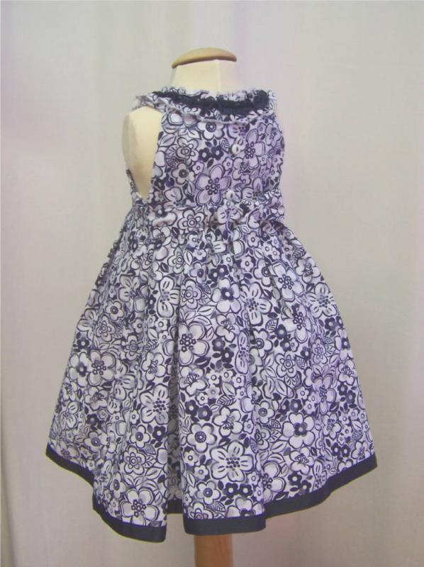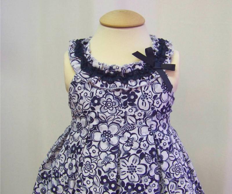 Bedårande vit och blå Sarah Louise festklänning. Klassisk skärning som sitter bra på ditt barn. Marinblå band och rosett runt halsrigninen, samma förekommer på nedre delen av kjolen. Band på ryggen som kan knytas till en rosett. Knäppning baktill. Vit underkjol. Mycket vacker sommarklänning som passar till kalas, födelsedagar, fest och bröllop.