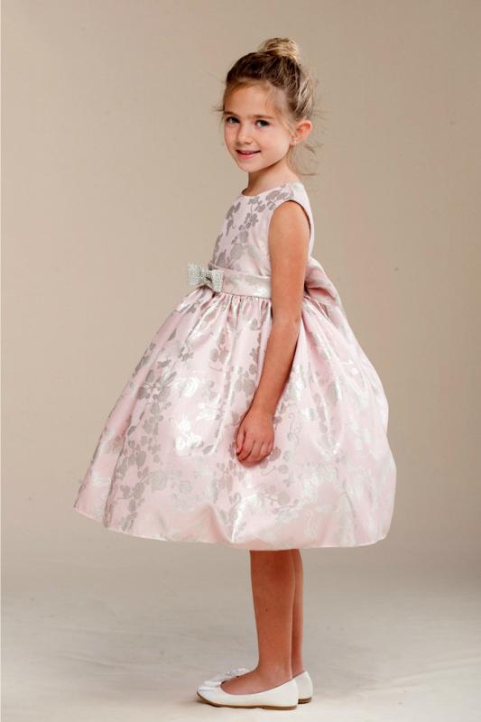 Ljuvlig brudnäbbsklänning / festklänning i shimrande rosa och silver. Rosmotiv med rosor och grenar i silver på det rosa tyget. Brett band i midjan som fortsätter i ryggen och kan knytas till en stor rosett. Stor avtagbar rosett i silver pryder midjan. Underkjol med tyllkant ger extra vidd. Blixtlås i ryggen.
