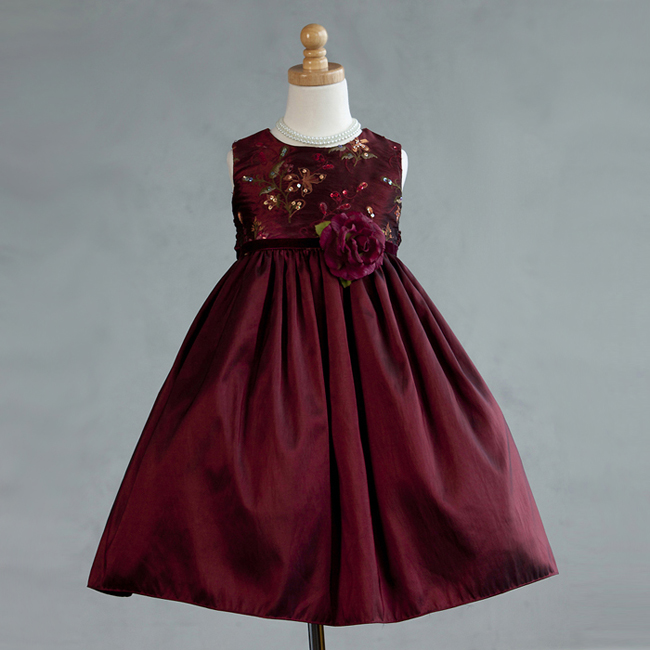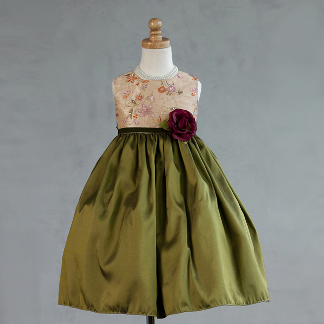 Välj mellan två olika färger: helt vinröd eller klänning med grön kjoldel och champagnefärgad liv med broderier i grönt, orange och rosa! Förtjusande söt.