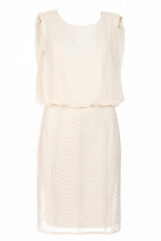 Vacker klänning med nederdel dekorerad med paljetter och överdel av chiffong. V-ringad rygg. Mycket trendig modell som passar till många tillfällen.