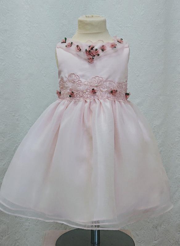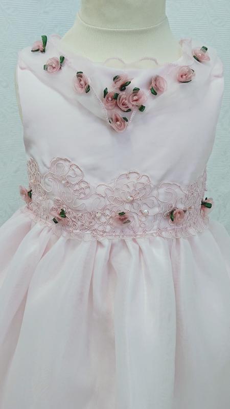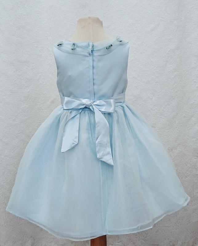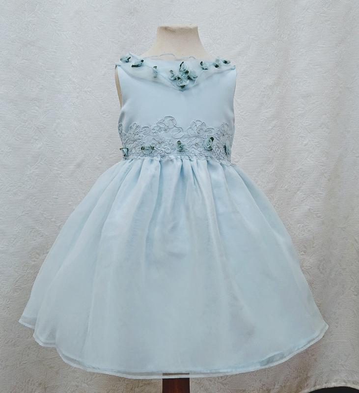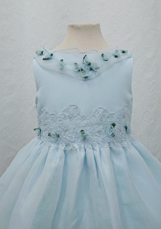 Underbara och ljuvliga festklänningar i pastelliga vårfärger. Välj bland ljusblått eller rosa. Små rosor dekorerar både halsringningen och midjan. Tyget lätt organza over satin. Underkjol med tyllkant ge vidd till kjolen. Knytband och blixtlås i ryggen. Mycket fin klänning till kommande fester eller prinsesslekar.