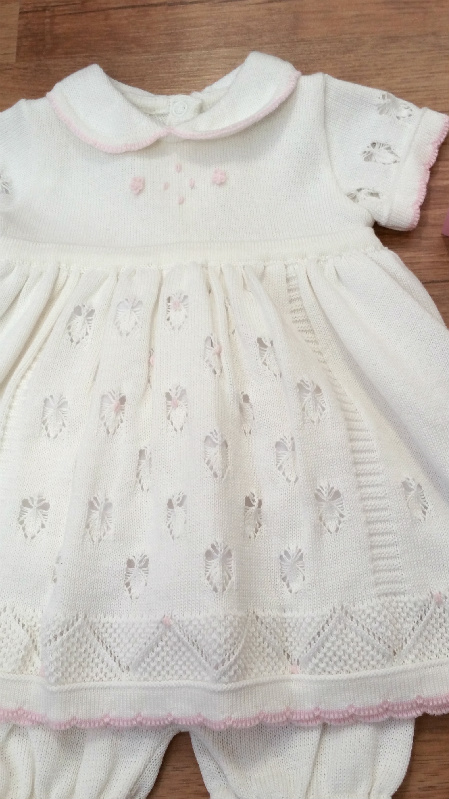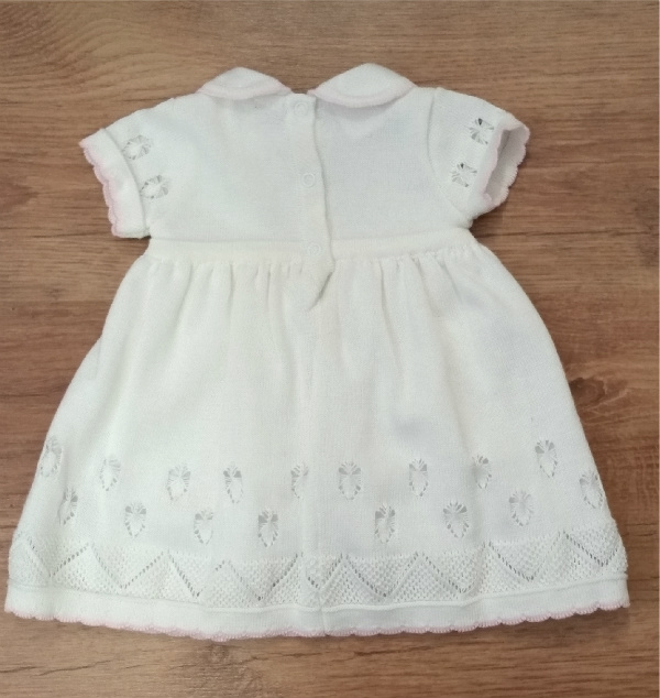Sötaste stickad klänning och matchande trosor. Gräddvit klänning med korta ärmar, rosa detaljer runt krage, ärmar och kjolfållet. Livet dekorerat med små rosa blommor. Underkjol med vacker spetskant. Knäppning baktil. Finklänning som passar som första klänning för vardag och fest. Mycket fin present till nyfödd bebis!