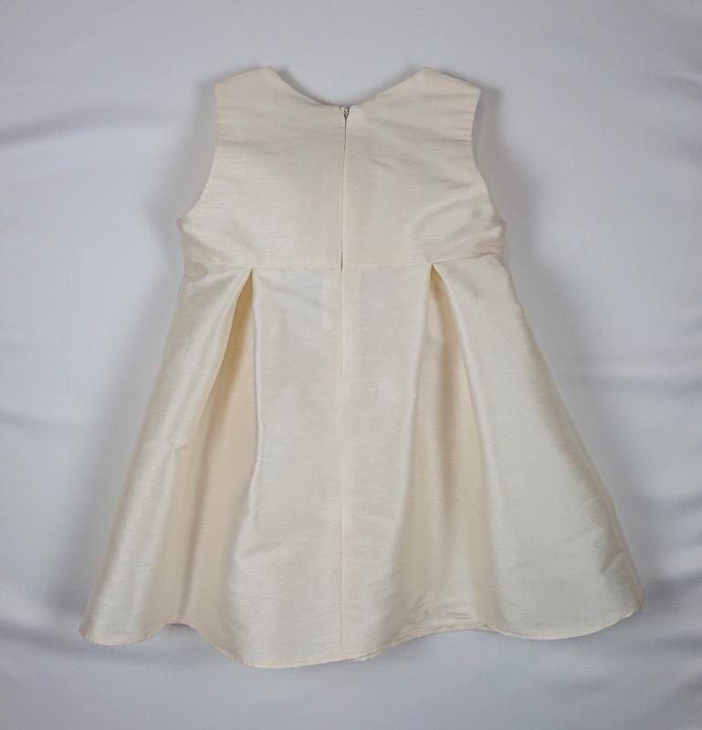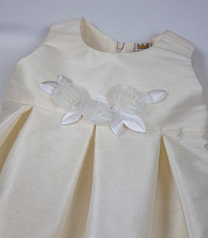 Vacker tunikaformad babyklänning till alla festliga tillfällen. Ärmlös finklänning med sidenblommor och blad på bysten. Kjoldeln har tre veck fram och två bak. Blixtlås i ryggen. Tillverkad av sidenliknande tyg i polyester. Mycket bekväm modell för de allra minsta. Du kan ha body under eller kofta över om det är lite kyligt. Perfekt för dop, fest och kalas.