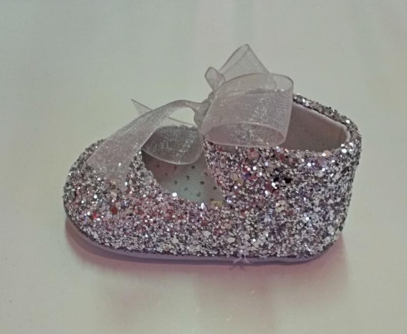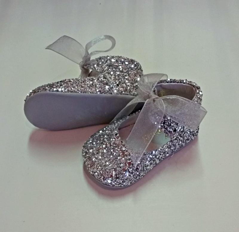 Ljuvliga glitterskor till lilla prinsessan! Hela skorn är täckt med silverglitter. Snörning med vackert silverfärgad organza band. Tillverkat i skinn. Små storlekar, se inntermått nedan.