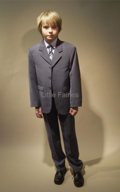 Mycket stilig grå barnkostym i fem delar. Slät grå väst med satintyg bak och band så att man kan justera storleken något. Mtchande gråa byxor och kavaj. Byxor med resor i ryggen samt två fickor på framsidan. Plastron eller slips i silver medföljer. Mycket fin pojkkostym som passar till alla högtider från dop till bröllop. Tillverkad av fint lite mjukare material som tilltalar barn och är bekvämt att ha på sig.