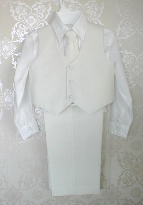 Mycket stilig gräddvit kostym till sommarens alla högtider! Fem delar består av kavaj, byxor, väst, skjorta och slips.