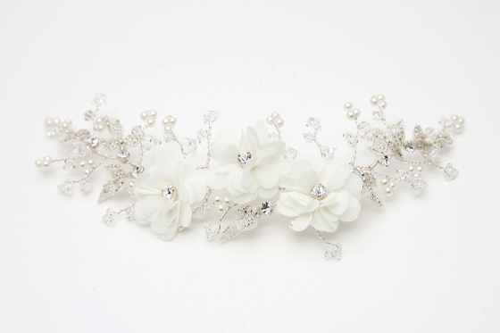 Vacker böjbar och lättarbetad hårsmycke, hair vine, med sidenblommor, kristaller och pärlor. Fästes i håret med hjälp av hårpinnar. Sätt den på sidan eller ovanför slöjan.