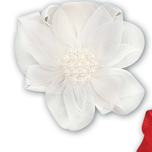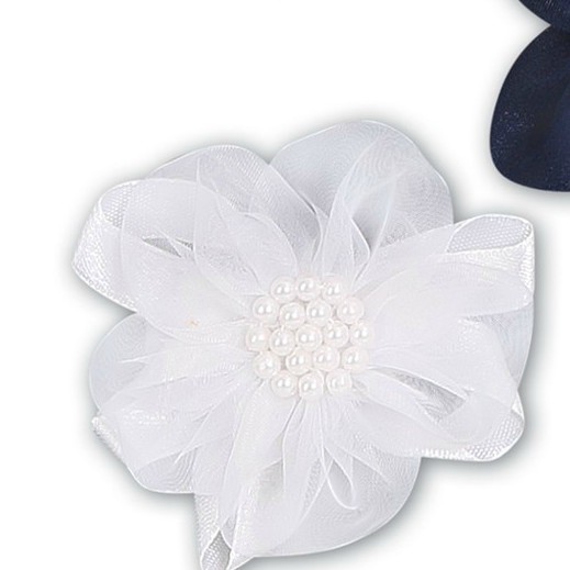 Söt hårspänne med organzablomma som vilar på sidenrosett. Blomma dekorerad med pärlor. Mycket söt hårspänne!