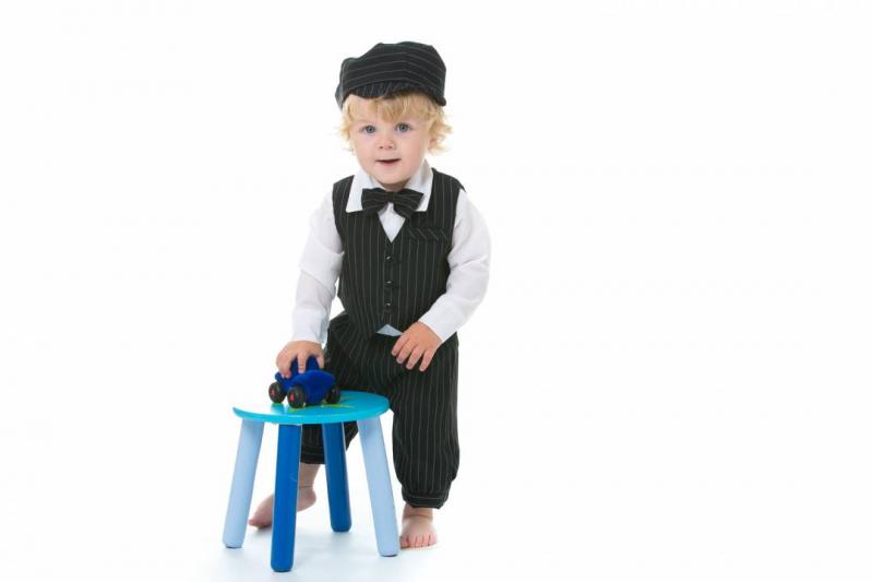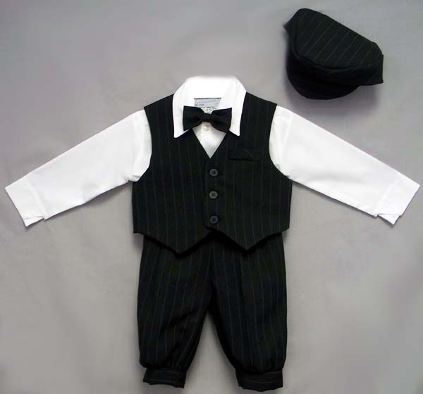 Tuff kritstrecksrandigt barnkostym med keps! Settet består av väst, fluga, kinckersbyxor och keps i samma kritstrecksrandigt tyg samt vit långärmad skjorta. Mycket söt till de minsta pojkar.