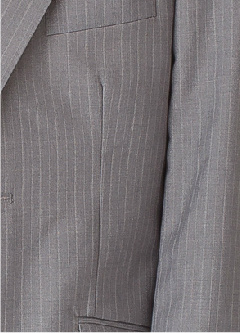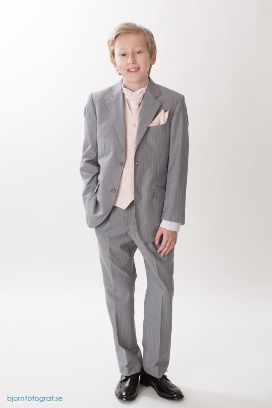 Mycket elegant något slimmad ljusgrå kostym av högsta kvalite. Kostymset består av kavaj med två knappar, två fickor och brösficka samt byxa. Tyget är ljusgrå med svagt kritstrecksrandig. Mycket fin insida som kan jämföras med herkrostymer.
