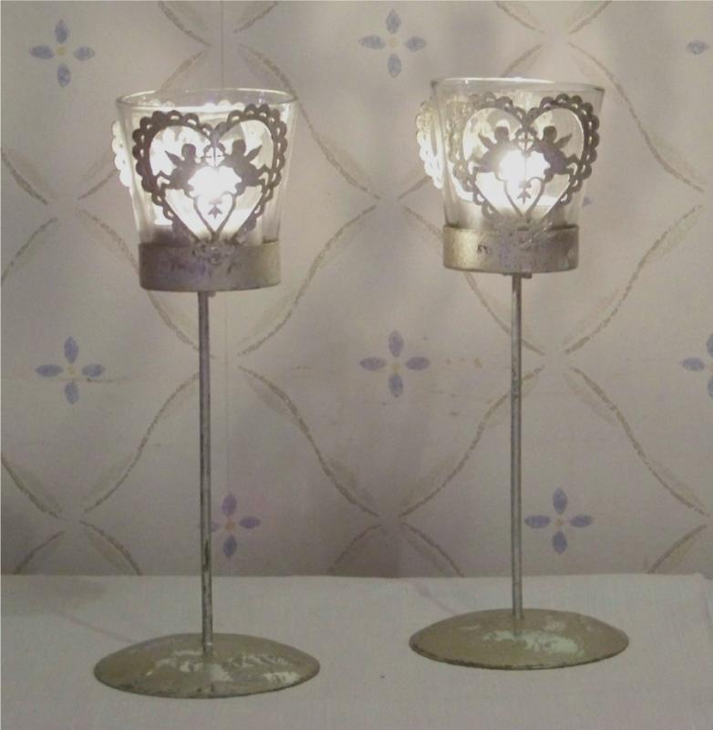 Mycket vacker ljuslykta med fot i Shabby Chich stil. Glasslykta på foten. 2 st hjärtor med två änglar i vardera hjärta.