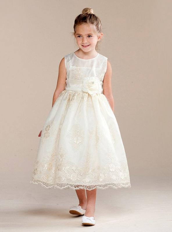 Vacker ärmlös finklänning i spets för bröllop och fest. Vacker vågig spetskant längst ner. Brett band i organza med avtagbar blomma dekorerar midjan. Bandet kan knytas till en rosett baktill. Blixtlås i ryggen. Underkjol med tyll. Mycket elegant festklänning med vacker varmare färg, spetsen skimrar lite av champagne.