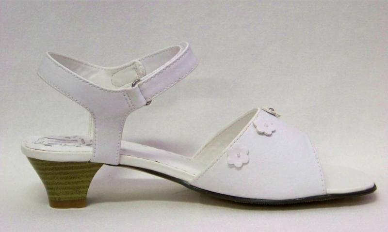 Vita festsandaletter med bred klack. Klackhöjd ca 4,5 cm. Små blommor dekorerar foten. Rem med kardborrband runt ankeln. Passar fint till kalas, fest, bröllop och skolfest.