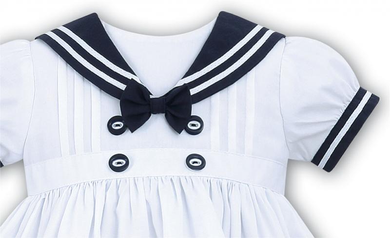 Klassisk vit och blå sjömansklänning med sjömanskrage. Finns i storlekar 62-98 cm.