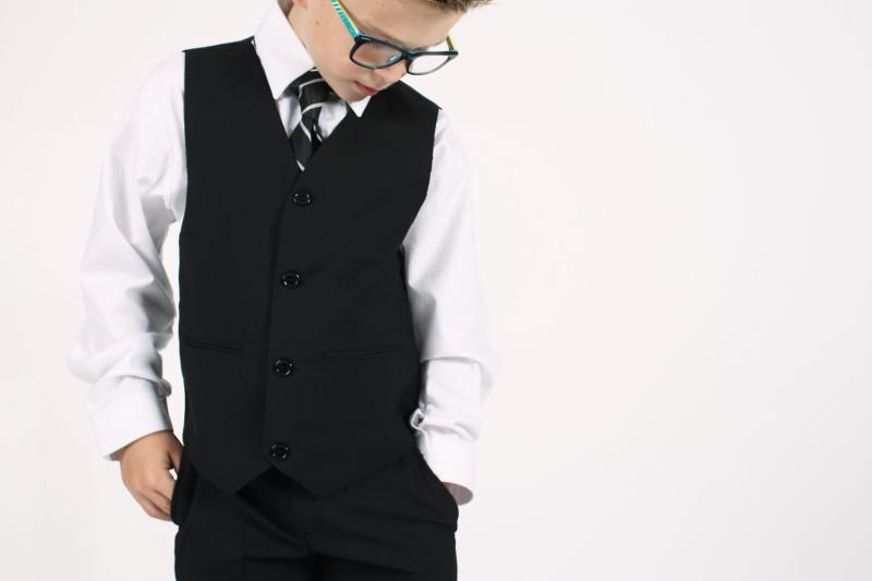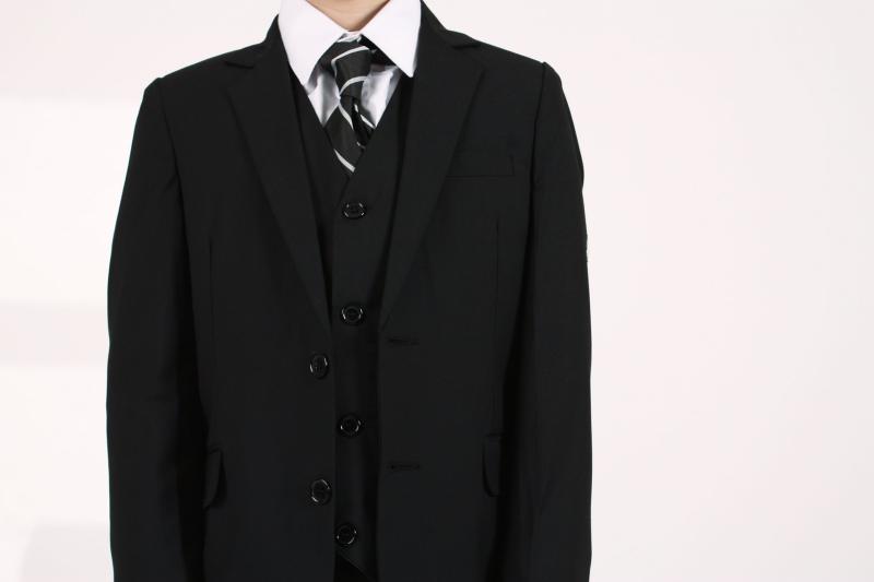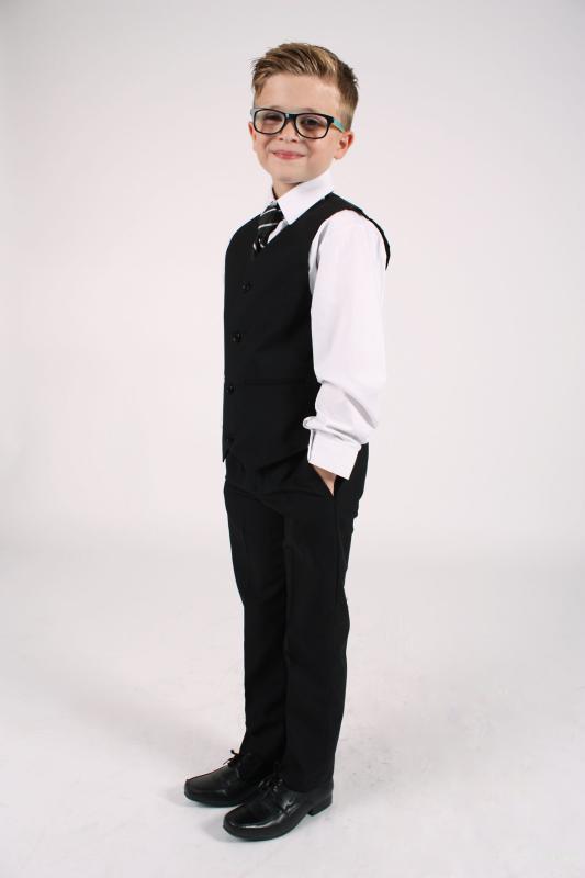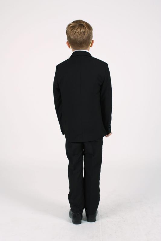 Stilig svart kostym till bröllop, kalas och fest. Kostymen består av fem delar; kavaj, väst, byxa , vit långärmad skjorta och svart vitrandig slips. Samma modell till baby, barn och tonåringar! Så härligt att ha samma modell till familjens alla små gentlemen.