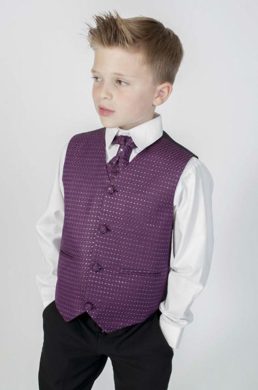 Barnväst set inkluderar purpurfärgad väst, kravatt och näsduk. Väst med justerbar midja. Vacker diamant mönstrad tyg med glitter tråd på. Västens ryggsida av slätt tyg. Västen är helfodrad och har två fickor på framsidan. Kravatten har kardborreband. Perfekt väst för en liten gentleman för att piffa upp kostymen eller använd utan kavaj.